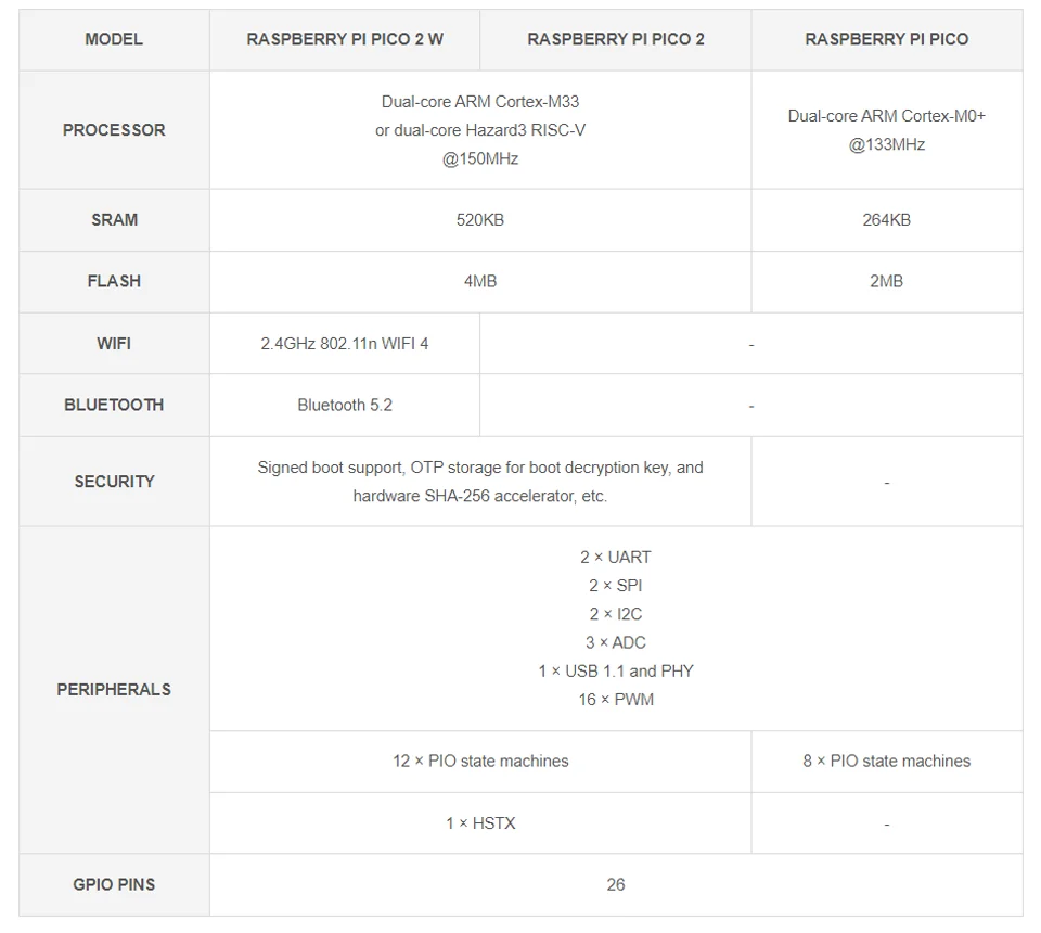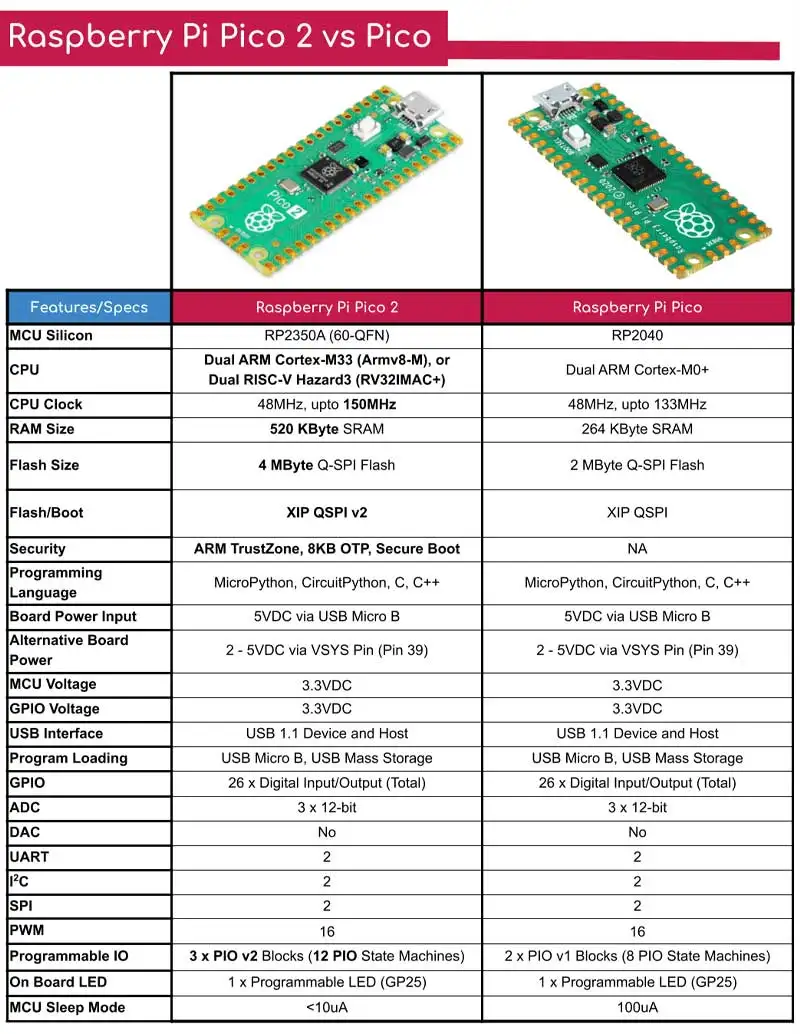 [] Raspberry Pi Pico comes with dual ARM Cortex-M0+, while the new Pico 2 comes with a Dual-Core ARM Cortex-M33 and a Dual-Core RISC-V Hazard3. Flexible clocking system, with configurable up to a maximum speed of 150MHz! This tiny MCU comes with a whopping 520 Kbyte of SRAM, an external QSPI Flash with a capacity of 4 MByte, and enhanced eXecute in Place (XIP v2). Larger RAM and Flash size enable you to write high-level programming languages like MicroPython and CircuitPython for Raspberry Pi Pico 2.