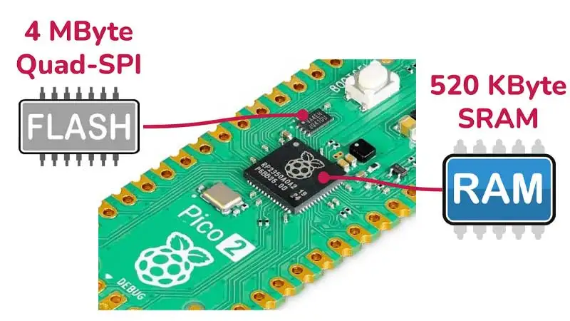 [] With 4 MByte of external QSPI Flash and 520 KByte of SRAM on Raspberry Pi Pico 2, it will never prompt you about not having enough memory 🙂 Besides, the large size of RAM and Flash also enable Raspberry Pi Pico 2 to be supported with higher programming languages such as MicroPython, CircuitPython, or even Javascript. We believe there will be RTOS (Real Time Operating System) for it too.