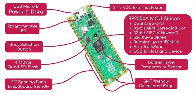 Note: The photo shown is Raspberry Pi Pico, Pico 2 is similar.