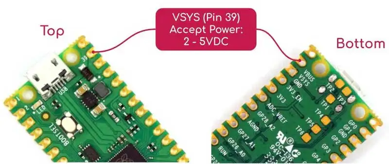 [] The USB Micro B receptor is the main power input to get the Raspberry Pi Pico 2 “running”, just connect the USB cable to any USB port and it will supply the power needed for the MCU to execute the program. In the case where you do not want to use the USB port, for example, a battery-powered, or a customized product; do not worry, Raspberry Pi Pico 2 comes with a flexible onboard buck-boost Switch Mode Power Supply (SMPS) that is capable of accepting2 to 5VDCinput and converts it to a stable 3.3V supply for the RP2350 MCU to operate. Simply awesome! The pin isVSYS(Pin 39). With a wide voltage range, Raspberry Pi Pico 2 can be powered by USB, 2 x AA battery, 2 x NiMH AA battery, 1 x 18650 Li-ion battery, or 1 x Cell LiPo battery!